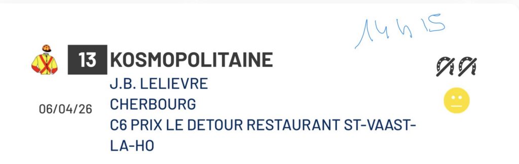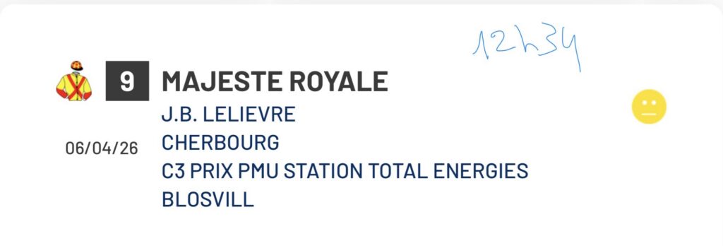 Majesté Royale et Kosmopolitaine à Cherbourg lundi admin 4 avril 2026 Leave a Comment on Majesté Royale et Kosmopolitaine à Cherbourg lundi Posted in Programme de courses Tweet Author: admin