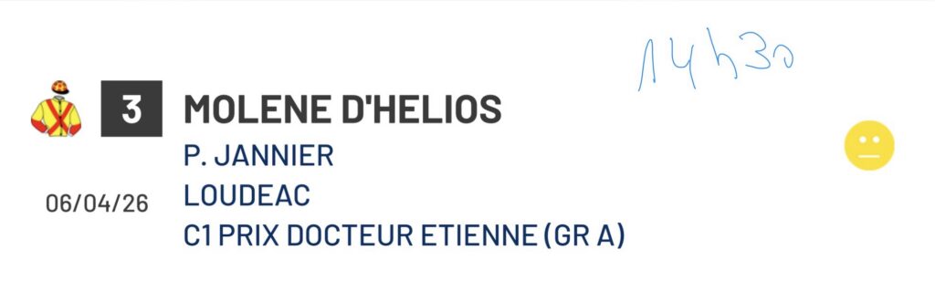Molène d’Helios à Loudeac lundi pour ses débuts admin 4 avril 2026 Leave a Comment on Molène d’Helios à Loudeac lundi pour ses débuts Posted in Programme de courses Tweet Author: admin